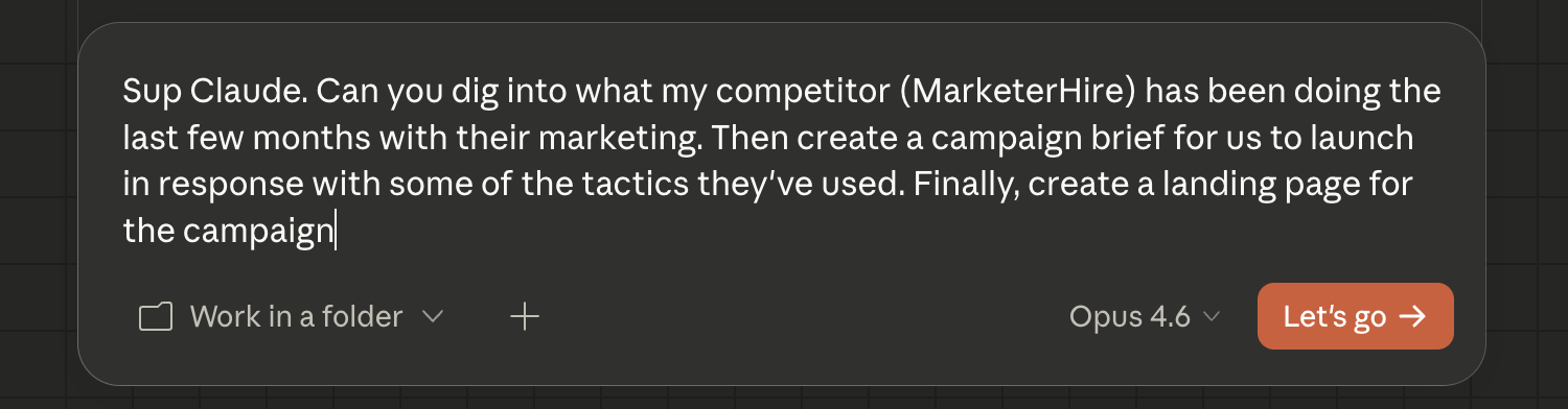 Now when I go to prompt Claude, I can ask to create a campaign brief based on competitive intel on what my competitors are doing within the last few months. And to spice it up a bit, I’ll ask Claude to create a landing page for the campaign.